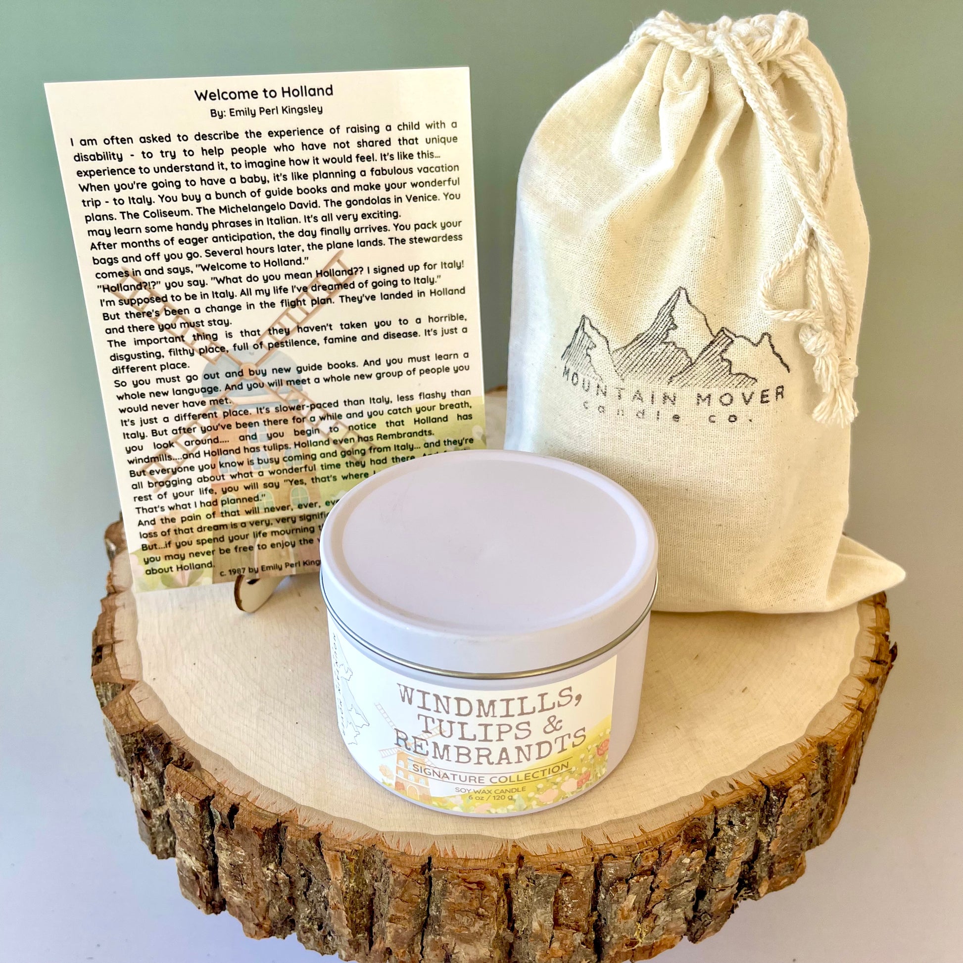 Inspired by Emily Perl Kingsley’s Welcome to Holland essay, this candle is a tribute to life’s beautifully unexpected journey. Floral and comforting with a resilient base, it honors the strength and grace found in raising a child with special needs. Crafted with care by artisans of all abilities, this candle invites you to pause and see the beauty in every detour.